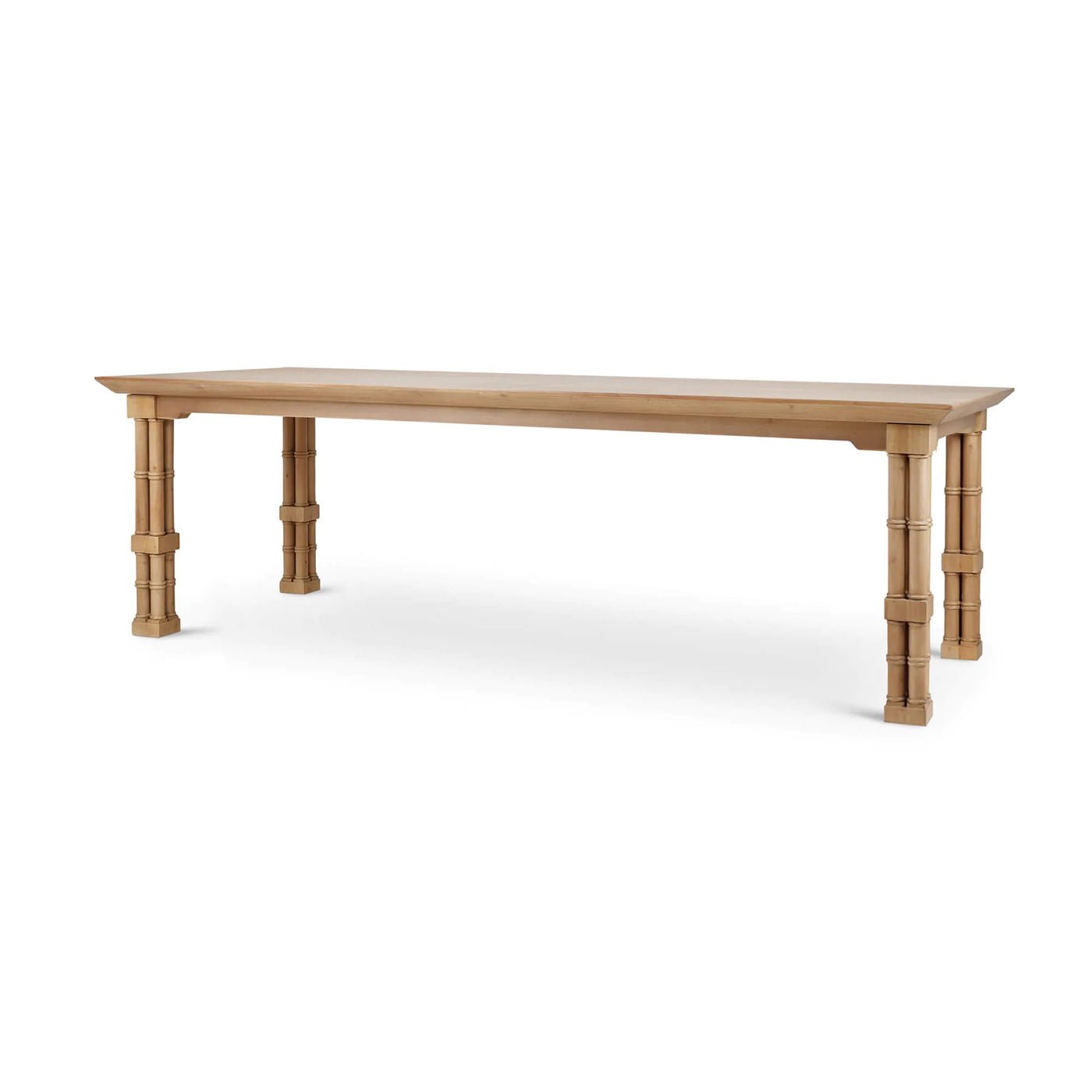 Fusion intemporelle de l'élégance coloniale britannique et du design d'inspiration insulaire, la table à manger Palm Beach Regency (96') allie un savoir-faire raffiné à une sophistication décontractée. Sculptée à la main en acajou et présentée dans notre finition en bois fruitier clair, cette table remarquable est dotée de pieds en imitation bambou en forme de colonnes anglaises classiques, reliées par une traverse en X qui apporte stabilité et style architectural.