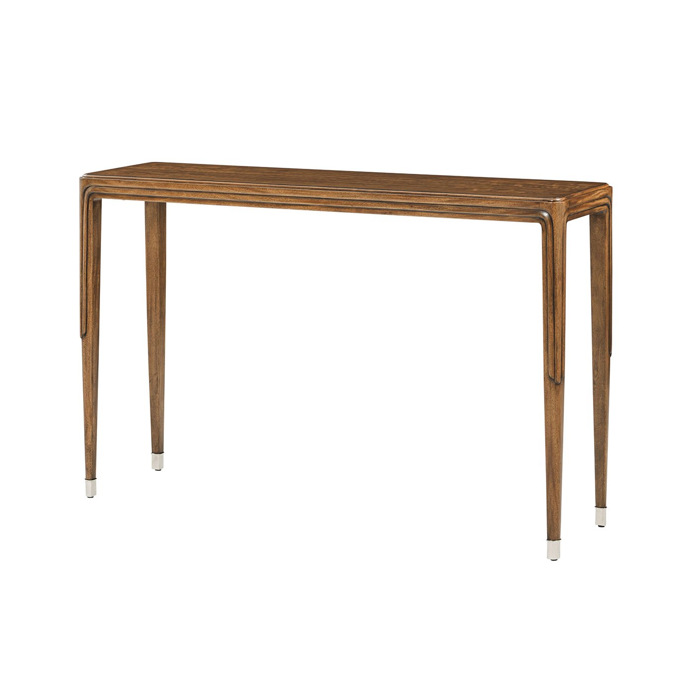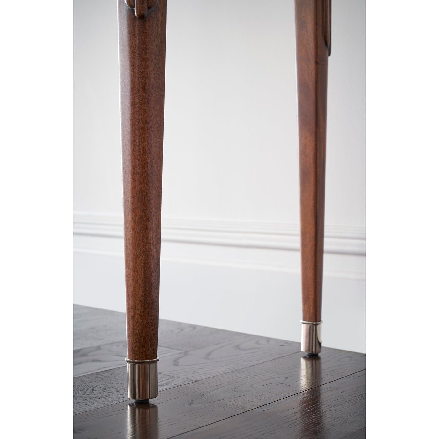 Des pieds fins et effilés avec des pieds subtils à capuchon métallique évoquent les formes géométriques épurées de l'ère Art Déco, faisant de cette table une pièce maîtresse saisissante pour toute entrée, couloir ou espace de vie.