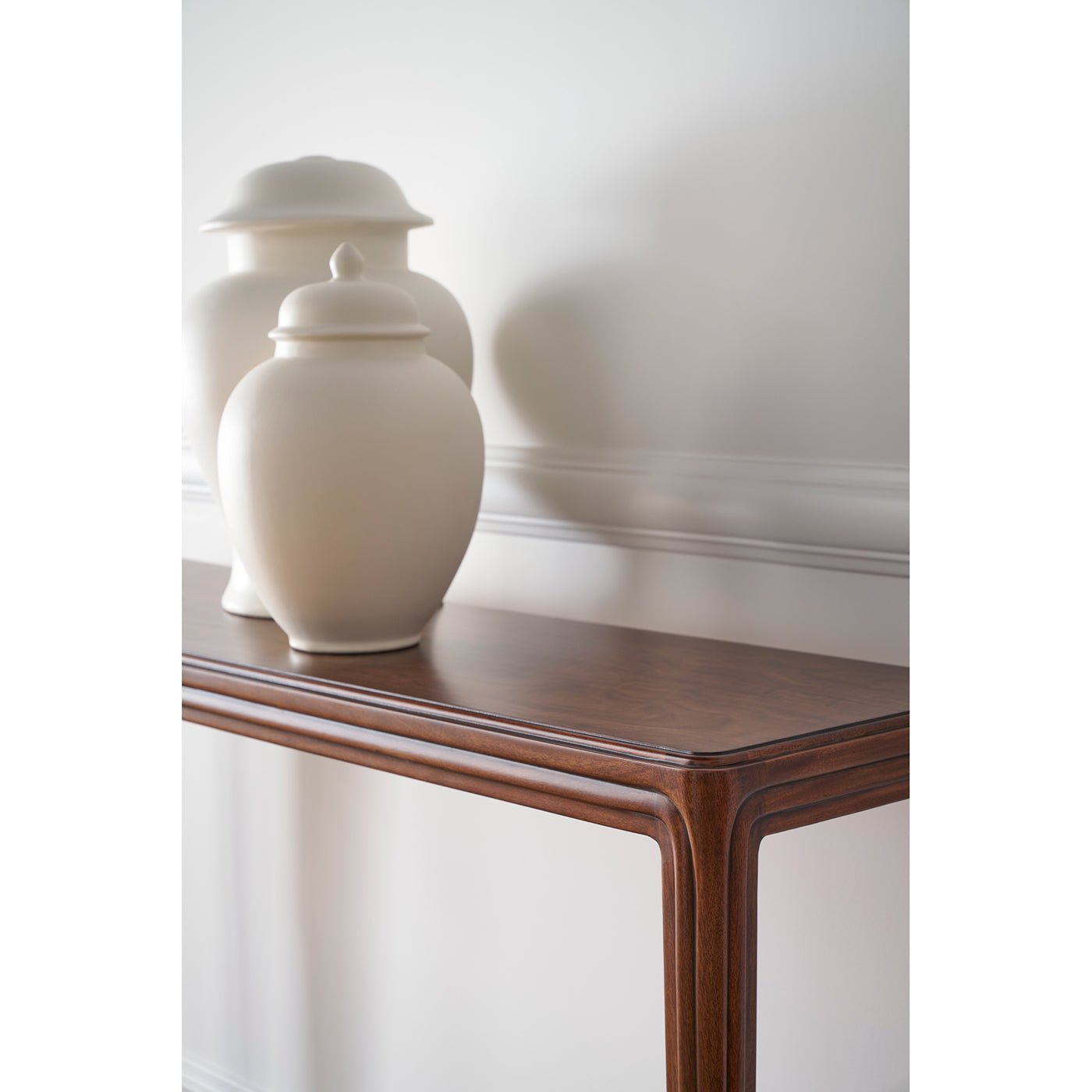 La console Art déco en noyer incarne l'élégance raffinée du design du début du XXe siècle. Avec son motif décoratif élancé et sa présence sculpturale, cette pièce témoigne d'une sophistication intemporelle. Le riche placage de noyer figuré, recouvert d'une luxueuse teinte Mayfair, accentue la beauté naturelle du grain du bois tout en rehaussant son allure vintage.